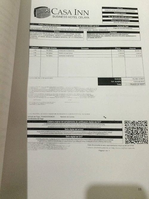 Hoy (martes) por la mañana el comité de la dirigencia municipal del Partido Revolucionario Institucional (PRI), en rueda de prensa, dió a conocer una factura donde presuntamente se muestra que el Municipio de Celaya, fue quién pago el desayuno realizado por panistas para la ex- primera dama Margarita Zavala. Dicho documento presentado mostraba la cantidad de 79 mil 900 pesos, los cuales fueron pagados por el municipio. A lo que el dirigente del PRI Jorge Montes, declaró que ya fue presentada una denuncia ante el Instituto Electoral (INE), tanto el estatal como el federal, para con ello se inicie a la brevedad la investigación correspondiente.
