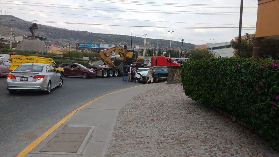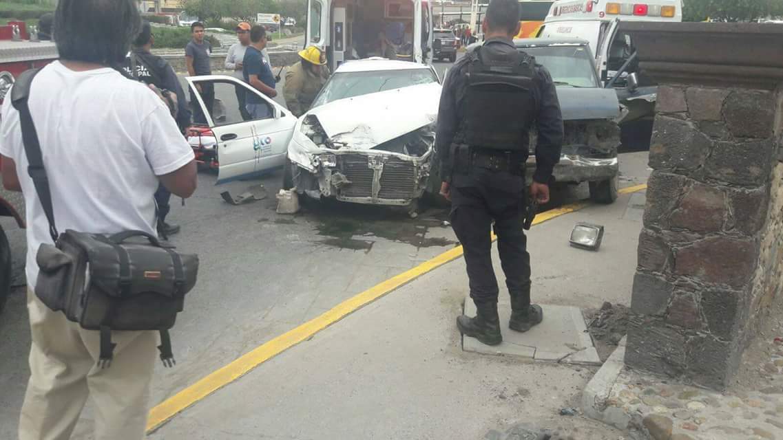 Choque frontal entre tres vehículos, que se registró la tarde del pasado lunes en la glorieta del Pipila, en San Miguel de Allende, dejo saldo de seis lesionados? dos moderados y cuatro leves.