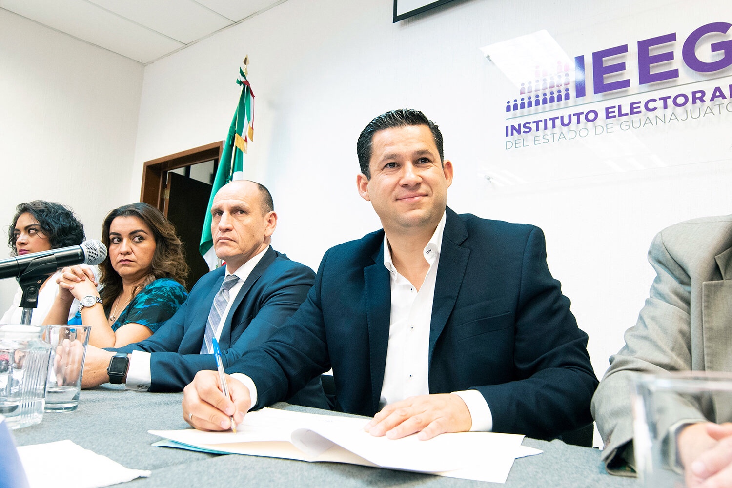 A la firma lo acompañaron su esposa Adriana Ramírez; el dirigente del Partido Acción Nacional en Guanajuato, Humberto Andrade, el presidente del PRD en la entidad, Baltasar Zamudio; y Ariel Rodríguez Vázquez, representante de Movimiento Ciudadano en Guanajuato.