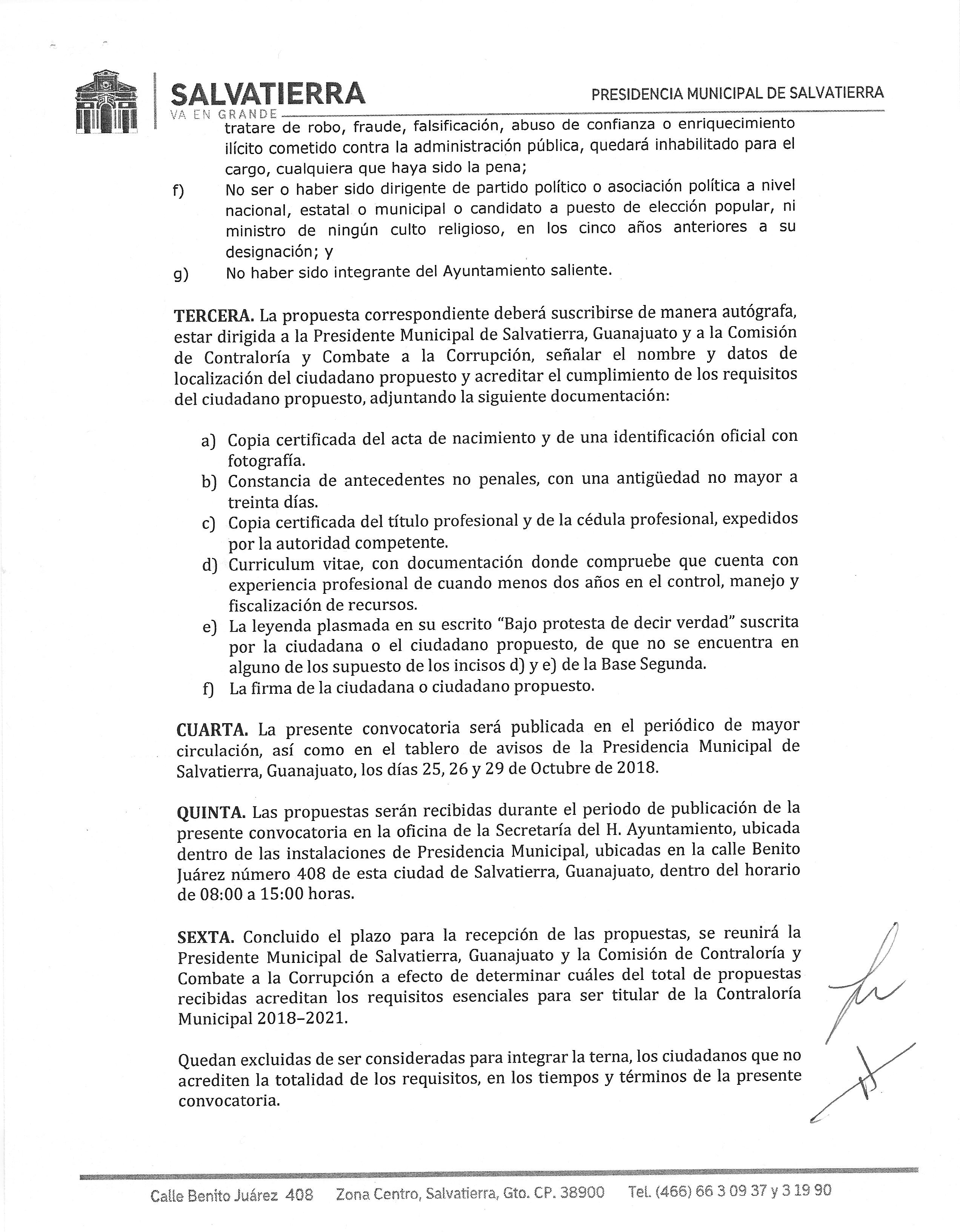 Dentro de los requisitos que se solicitan para llegar a ser contendientes para dicho cargo se encuentran, ser mexicano, contar con 3 años mínimo en el estado, edad de 30 años en adelante, contar con título profesional en carreras (administrativas, economía, jurídica y contable), gozar de buena reputación, no haber sido líder de algún partido político, no haber pertenecido a la administración anterior así como copias del acta de nacimiento, currículum, título profesional. Los documentos tendrán que ser entregados en la oficina de Secretaria de Ayuntamiento.