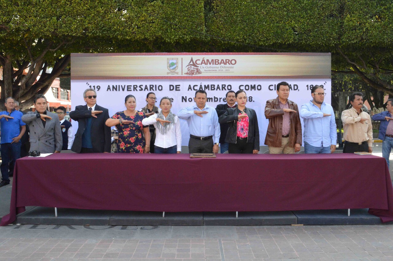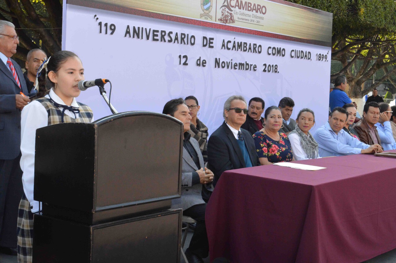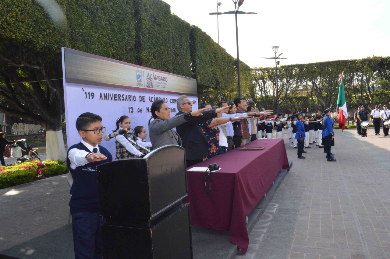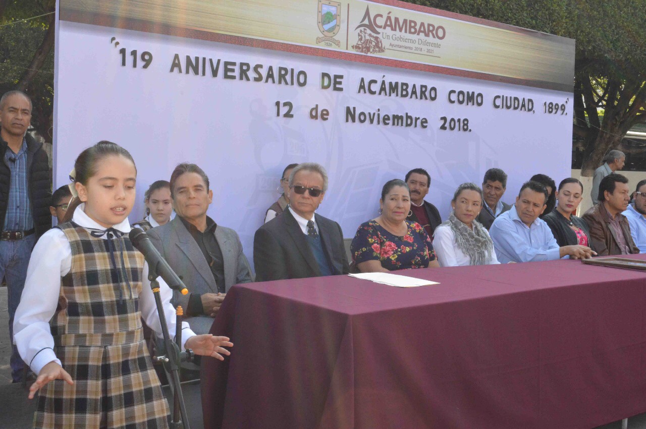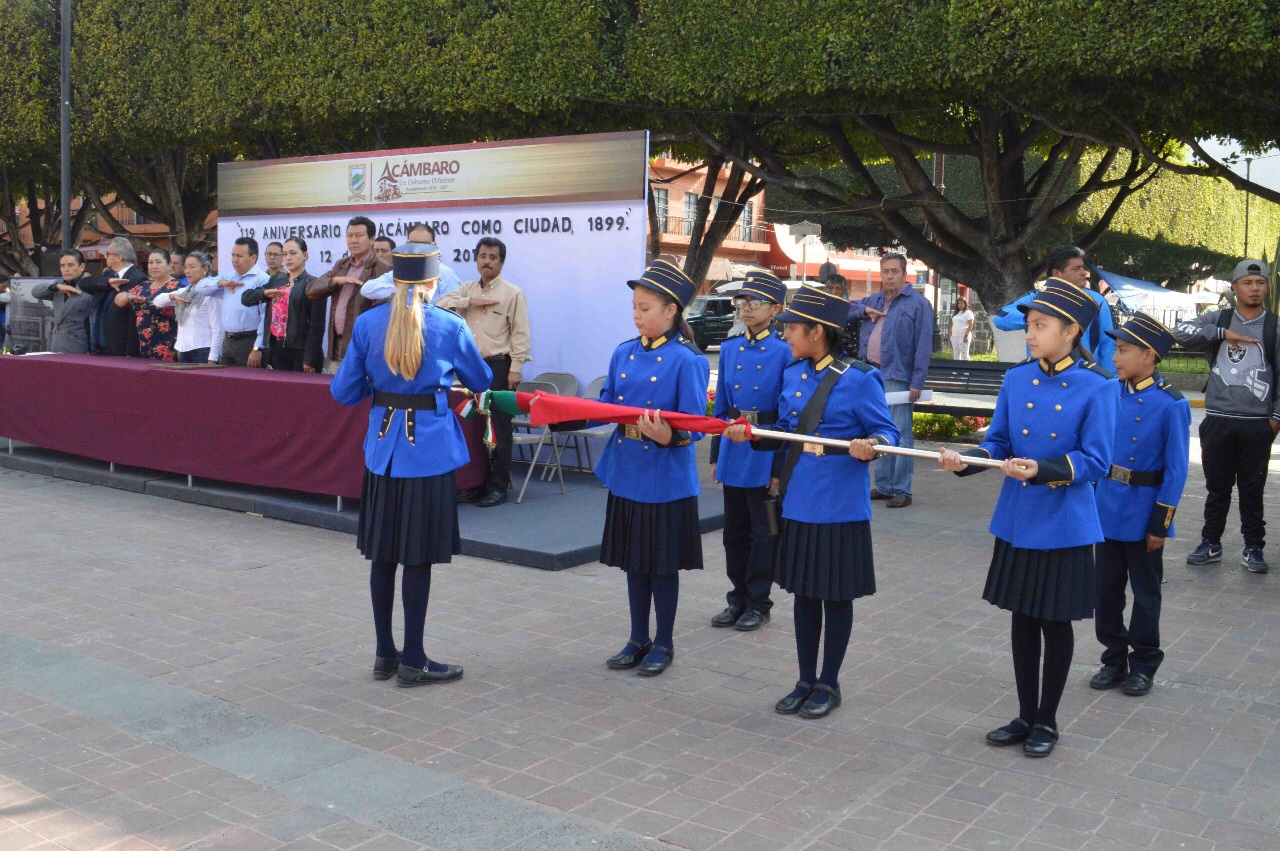 Con motivo del 119 Aniversario del Nombramiento de Acámbaro como Ciudad (1899-2018), la Plaza Cívica “Miguel Hidalgo” fue el escenario donde el Honorable Ayuntamiento Constitucional y el Comité Cívico y Cultural “Generalísimo Miguel Hidalgo” en coordinación con la Escuela Primaria Particular “Teresa Martín” conmemoraron esta fecha con un acto cívico.