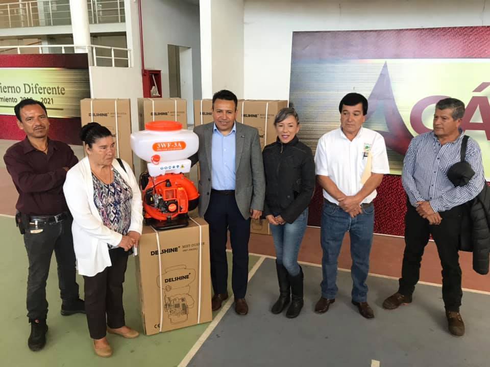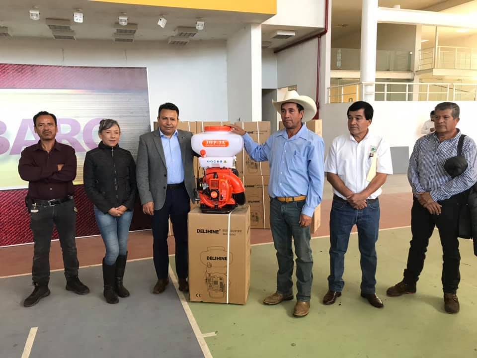 En la sede del Módulo COMUDE el alcalde, Lic. Alejandro Tirado Zúñiga, en compañía de la regidora de la comisión de desarrollo rural, Laura Ríos Cárdenas; y el director de desarrollo rural, M.VZ. Ernesto González Marín, entregaron las aspersoras.