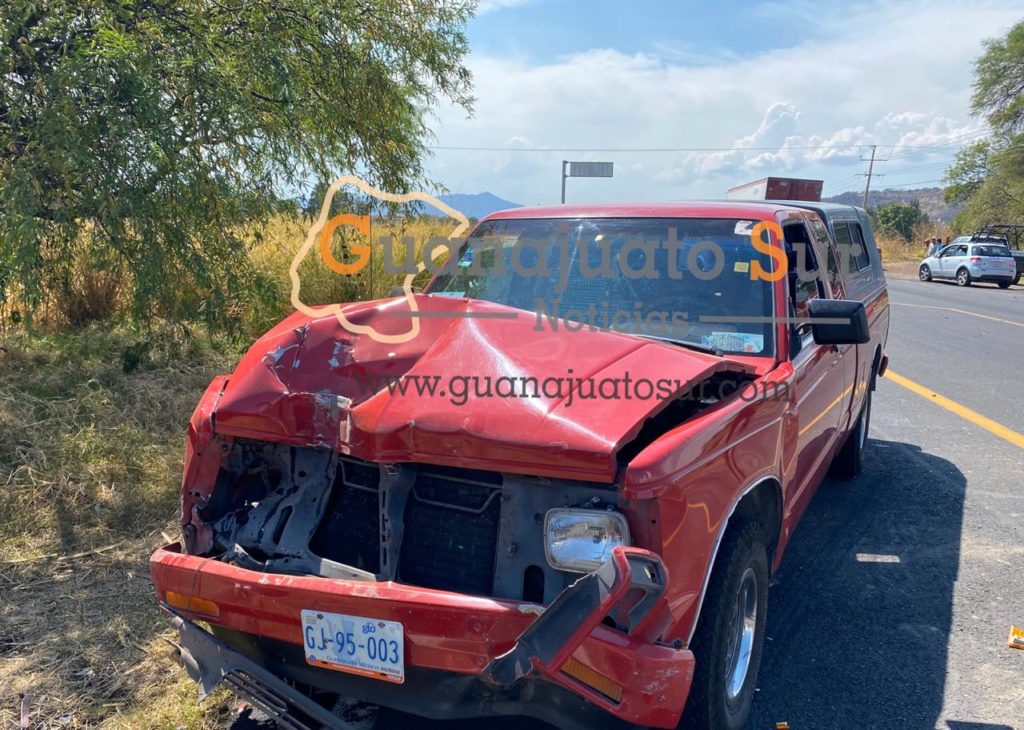 Autoridades comentaron que una camioneta color rojo de redilas se intentó incorporar sin precaución a la carretera Salvatierra Yuriría sin embargo fue golpeada por un tráiler que circulaba por dicha avenida, en la parte de atrás de la camioneta de redilas viajaban varias personas dos de ellas salieron volando mismas que fueron las que resultaron lesionadas en el accidente.