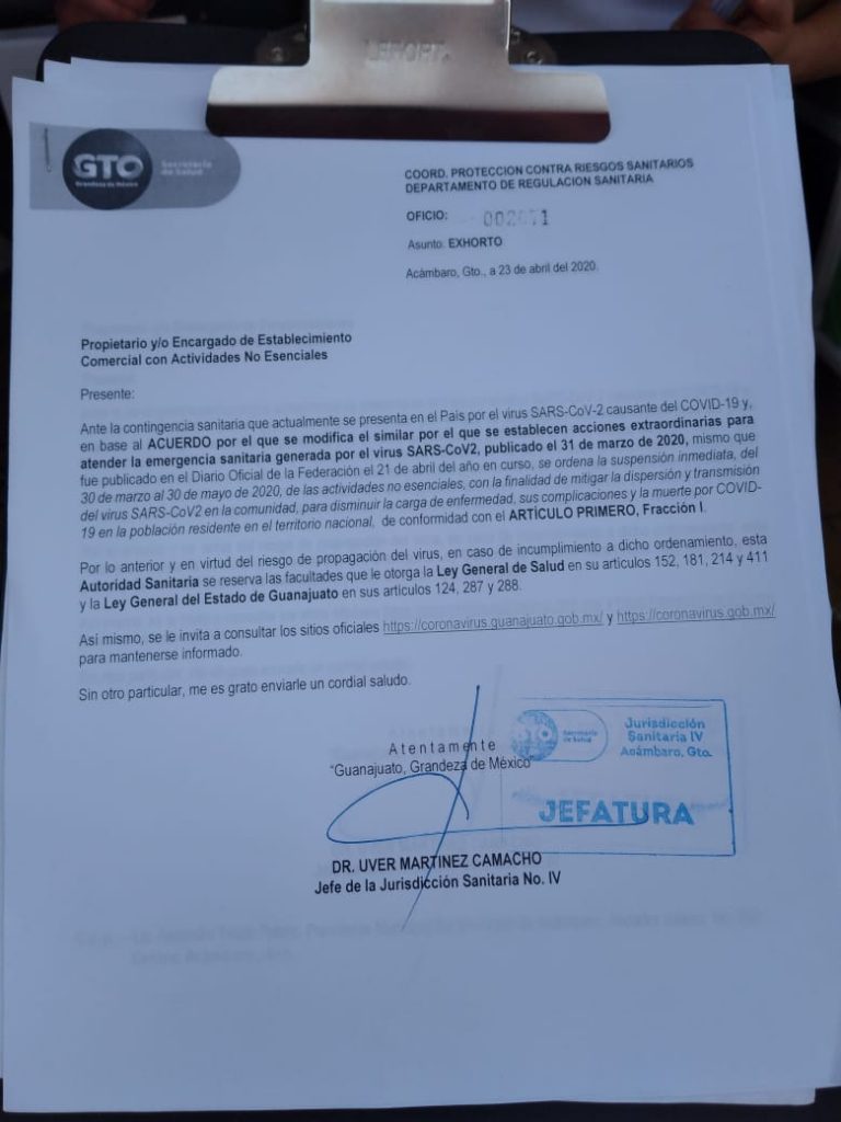 Con El Gobierno Municipal de Acámbaro, brinda el apoyo correspondiente al sector salud en cuanto a la entrega de notificaciones a los propietarios de los establecimientos comerciales que hay en la ciudad, y que no son esenciales, para que cierren de manera temporal sus negocios, durante la contingencia que ha generado el COVID-19.