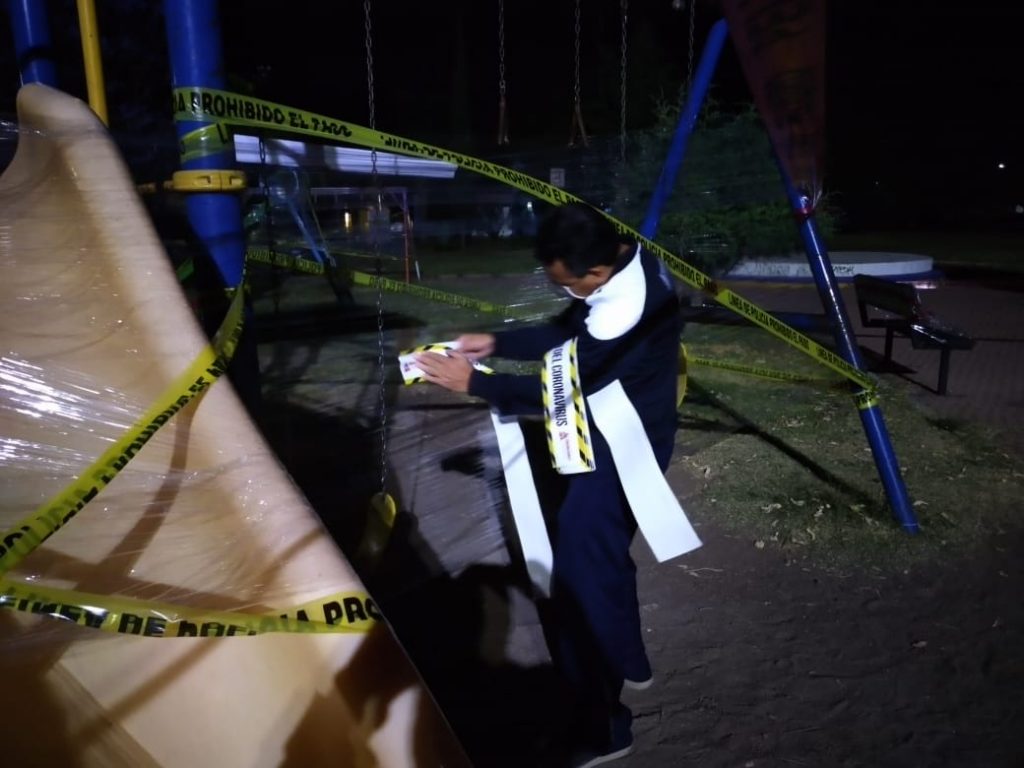 El presidente municipal Alejandro Tirado Zúñiga, acompañado por funcionarios de la administración y algunos miembros del Ayuntamiento, se ha dado a la tarea de emplayar lugares públicos que son asiduos por la población, así como colocar cintas de restricción en los espacios públicos,