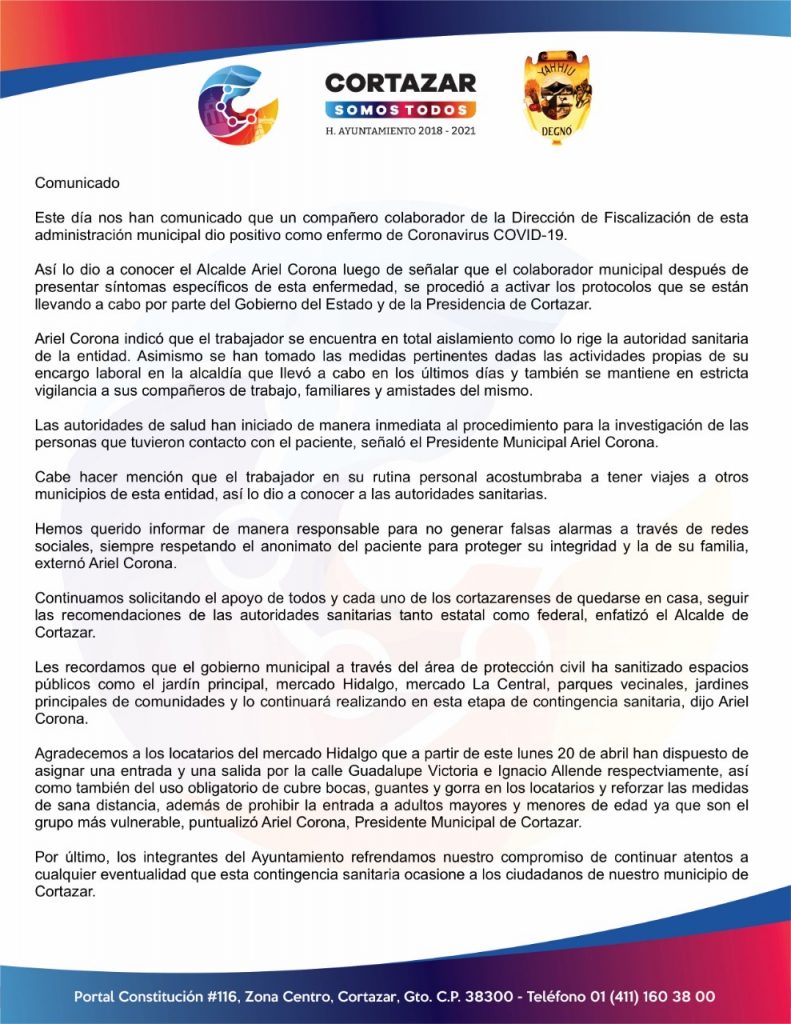 “Este día nos han comunicado que un compañero colaborador de la Dirección de Fiscalización de esta administración municipal dio positivo como enfermo de Coronavirus COVID-19”