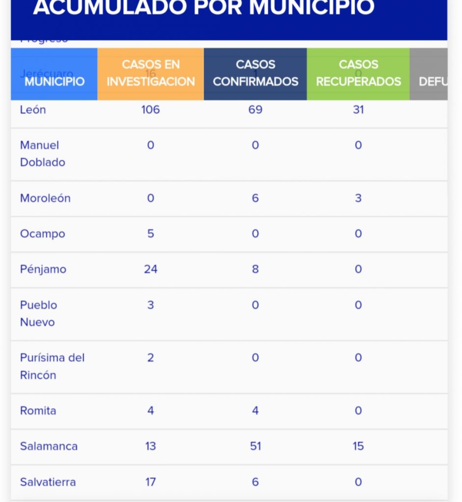 Salamanca tiene 13 casos en investigación, 51 casos confirmados, 17 fueron por trasmisión comunitaria, 15 casos recuperados y 6 han perdido la vida; Acámbaro cuenta con 14 casos en investigación, 12 confirmados siendo 10 de ellos por trasmisión comunitaria, y 3 defunciones.