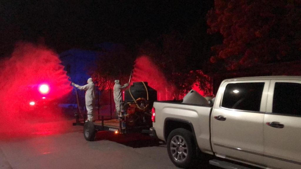 Se utilizaron 200 litros aproximadamente de agua clorada y diversos químicos no dañinos para la salud humana que neutralizan bacterias y virus en el ambiente.