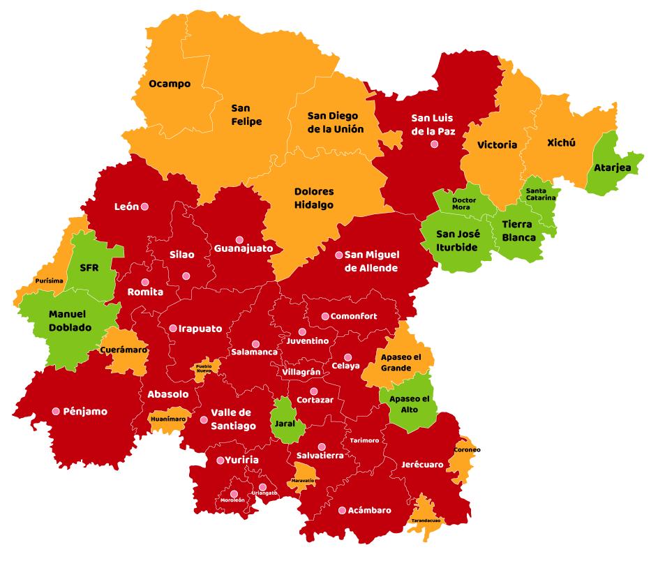 Los municipios con más casos en investigación hasta el momento han sido León con 56 casos en investigación, 61 confirmados, 30 casos ya recuperados y 23 de los confirmados fueron por transmisión comunitaria; Irapuato con 45 en investigación, 28 confirmados de los cuales 18 fueron por transmisión comunitaria y 7 recuperados.