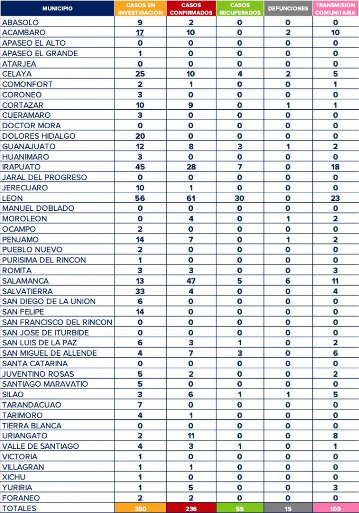Toda la información es con base a la tabla creada por la Secretaria de Salud la cual es actualizada cada que se registra algún caso de infección por el coronavirus, la cual pueden visitar en la pagina oficial https://coronavirus.guanajuato.gob.mx/.