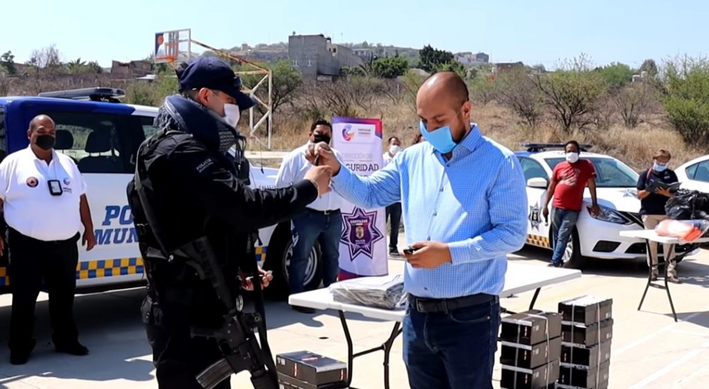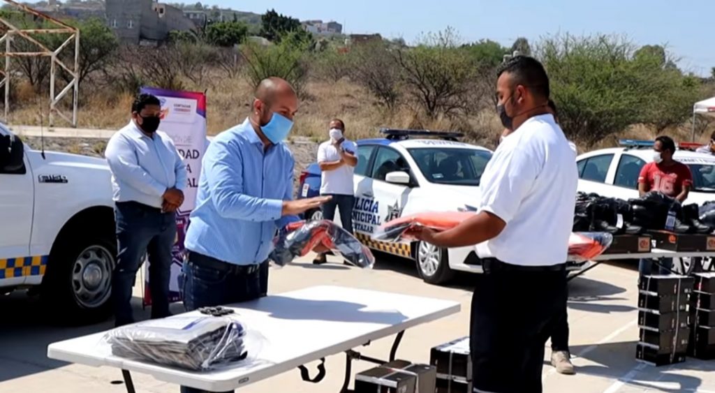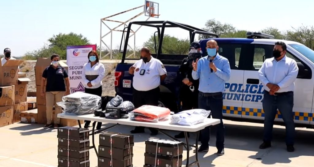 Con el apoyo del Gobierno del Estado y en presencia del presidente municipal Ariel Corona hizo entrega de 203 uniformes para elementos de Seguridad Publica, Tránsito y Transporte, Protección Civil y Centro de Atención de Llamadas de Emergencia 911, así como tres patrullas para seguridad y tres unidades para Tránsito y Transporte.