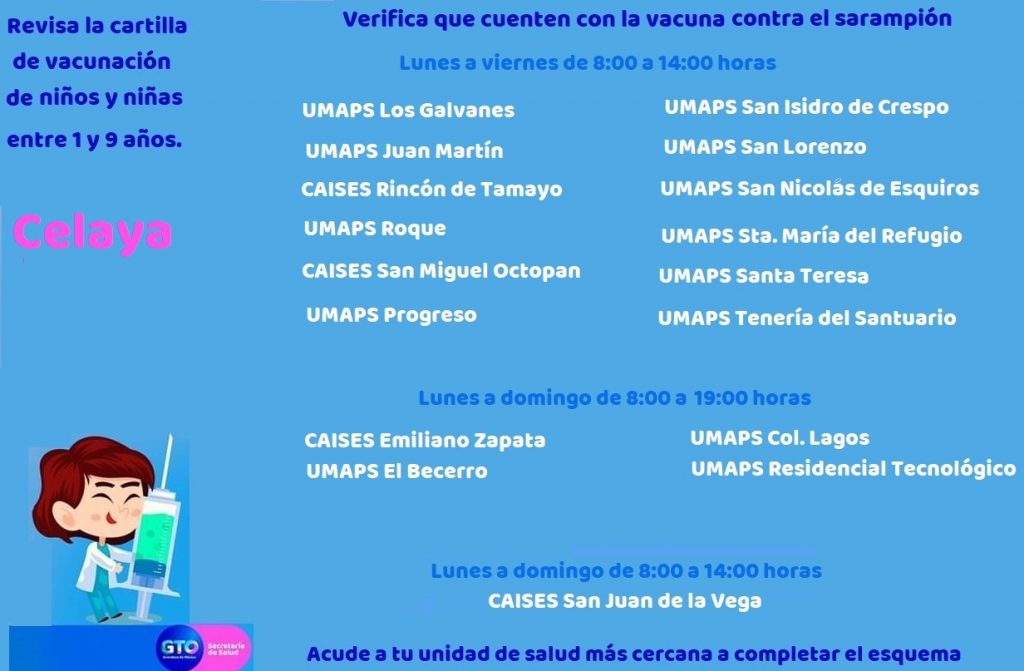 Debido a que la unidad CAISES Celaya, ubicada en la calle Mariano Jiménez no. 519, Col. Los Ángeles, ha sido asignada para atención de pacientes con síntomas de enfermedad respiratoria, el servicio de vacunación y la toma de tamiz neonatal se suspende de manera temporal en dicha unidad.