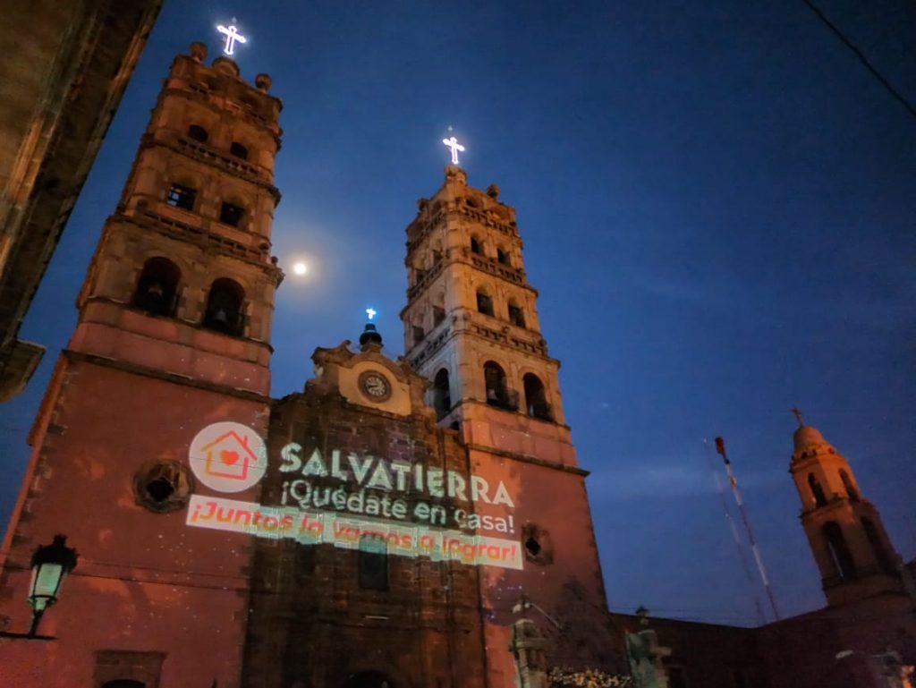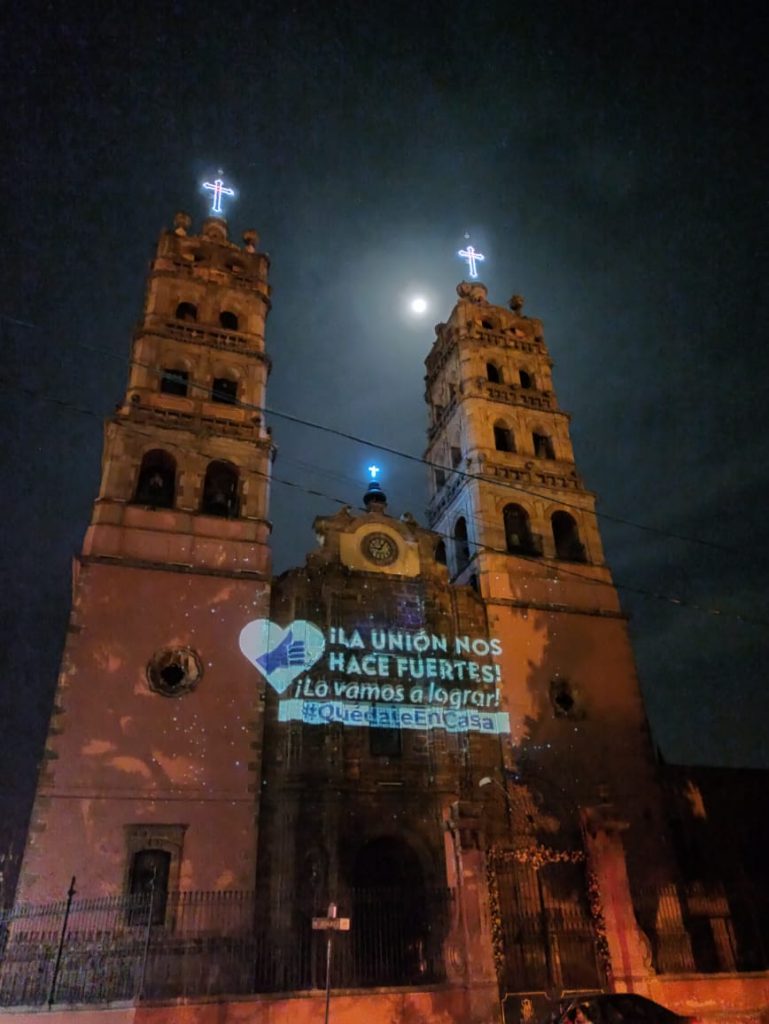 En la fachada del templo Diocesano proyectaron diferentes mensajes de quédate en casa