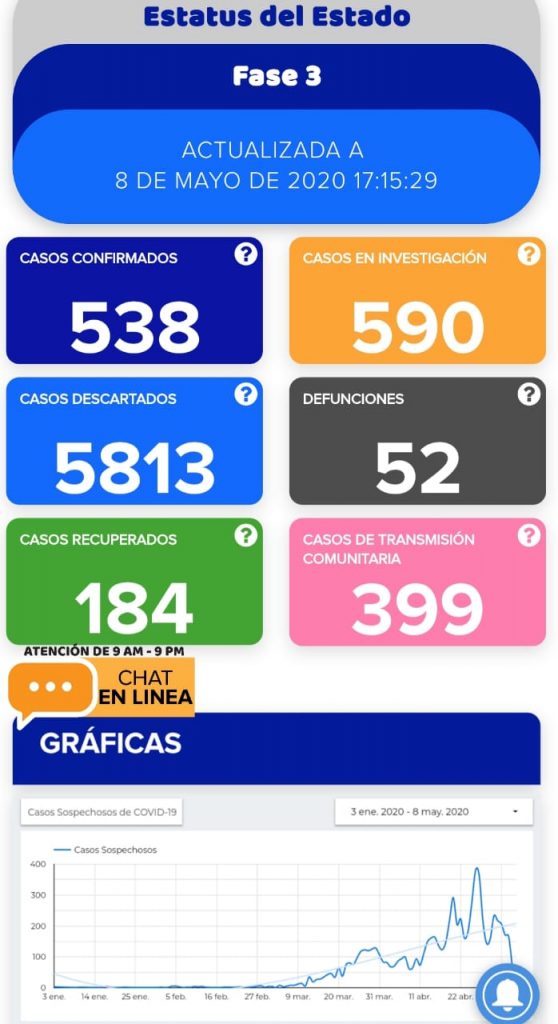 En el estado se cuanta, con 5,813 casos descartados, 538 casos confirmados, 590 casos en investigación, 52 defunciones, 184 casos recuperados y 399 casos de trasmisión comunitaria