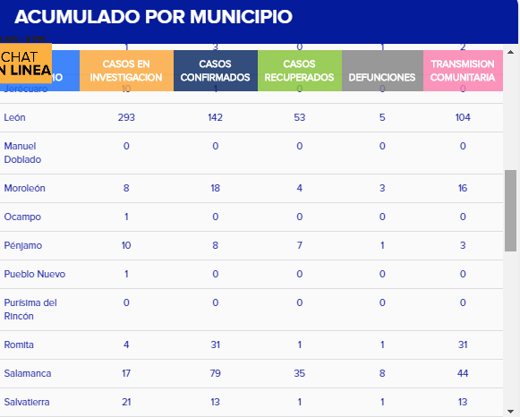 Toda nuestra información es con base a la tabla creada por la Secretaria de Salud la cual es actualizada cada que se registra algún caso de infección por el coronavirus, la cual pueden visitar en la página oficial https://coronavirus.guanajuato.gob.mx/.