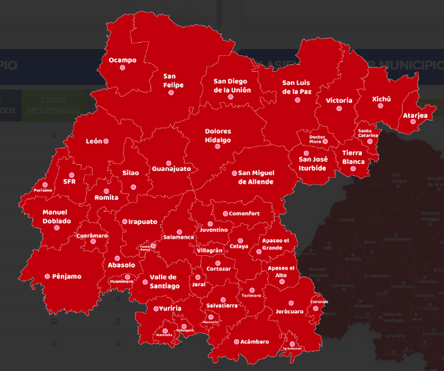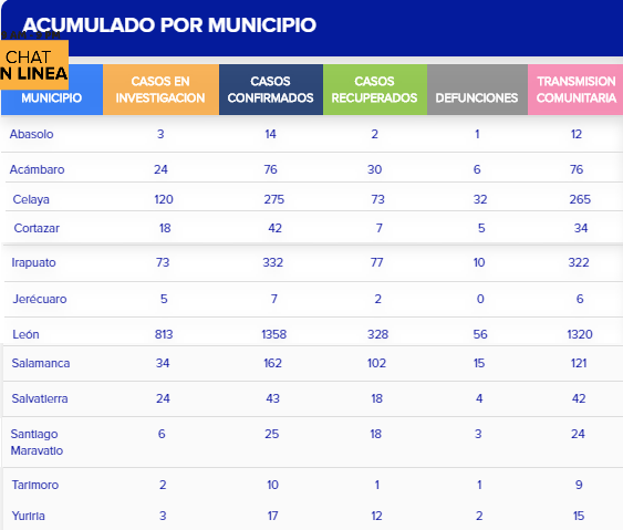 Toda nuestra información es con base a la tabla creada por la Secretaria de Salud la cual es actualizada cada que se registra algún caso de infección por el coronavirus, la cual pueden visitar en la página oficial https://coronavirus.guanajuato.gob.mx/.