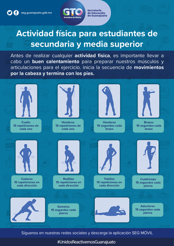 Para fomentar la activación física entre la comunidad educativa, la Secretaría de Educación de Guanajuato, SEG, ha elaborado una serie de programas y recomendaciones con el fin de que los estudiantes y sus padres de familia, así como los docentes, realicen actividades de fomento a la salud durante esta eta de contingencia por el COVID-19.