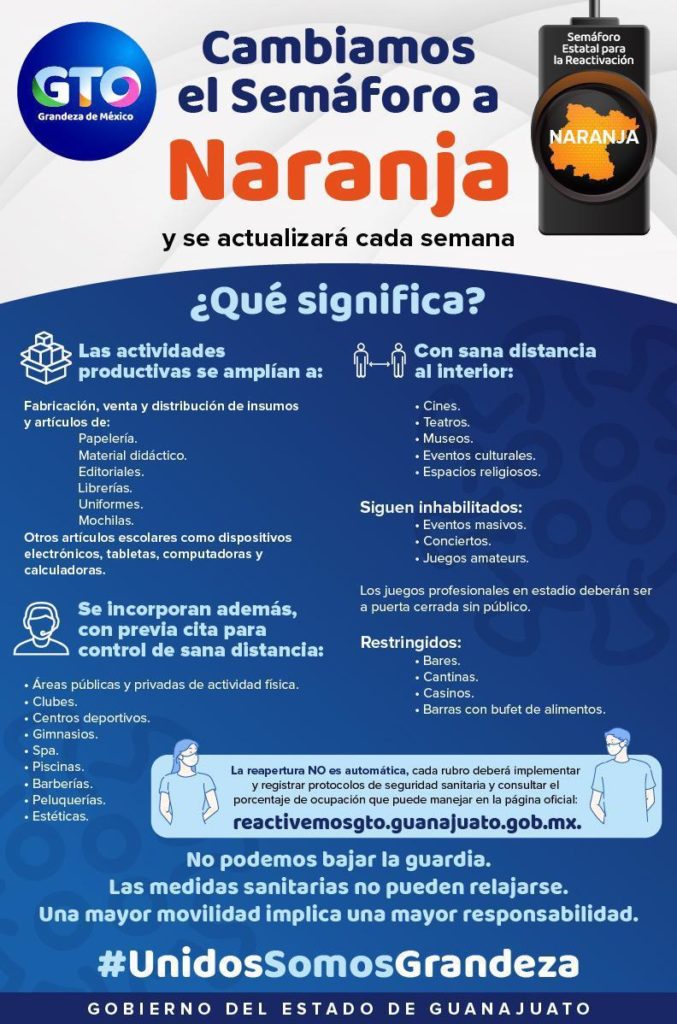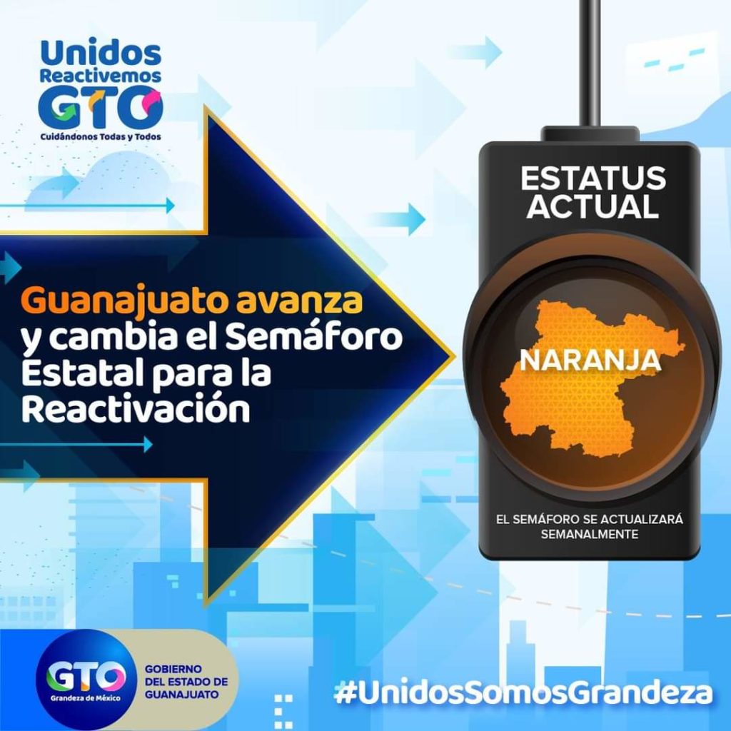 Oficialmente el día martes el semáforo cambio a naranja a pesar de que Guanajuato se encuentra en segundo lugar de casos activos, de acuerdo con el secretario de Salud Daniel Alberto Díaz Martínez comentó que existen buenos indicadores que permiten el cambio del color en el semáforo estatal.