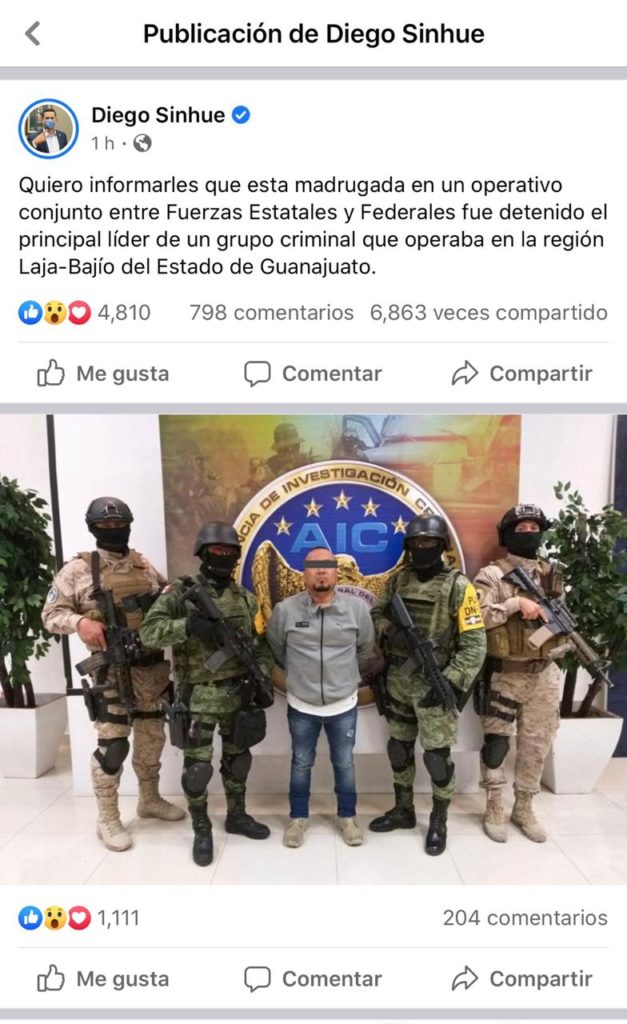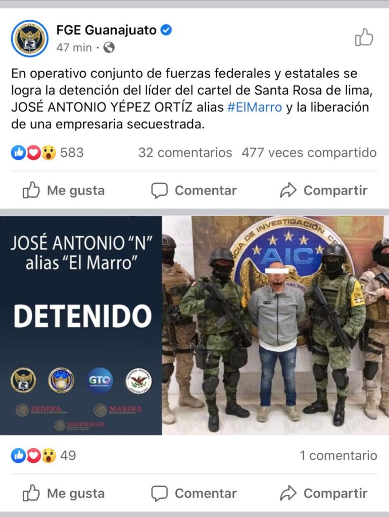 El gobernador del Estado Diego Sinhue Rodríguez y la Fiscalía del Estado anunciaron en redes sociales la detención de JOSÉ ANTONIO YÉPEZ ORTÍZ alias #ElMarro.