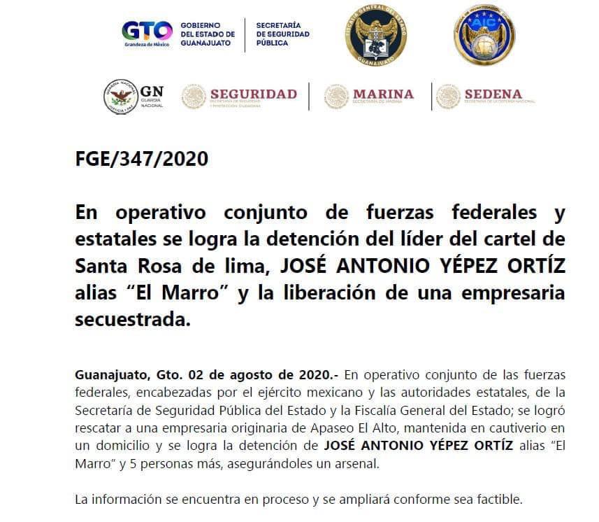 En el boletín informativo señalan; “En un operativo conjunto de las fuerzas Federales encabezadas por el ejército Mexicano y las autoridades estatales de la Secretaría de Seguridad Publica del Estado y la Fiscalia General del Estado, se logró rescatar a una empresaria originaria de Apaseo el Alto mantenida en cautiverio en un domicilio, y se logra la detención de JOSE ANTONIO YEPEZ ORTIZ, alias EL MARRO, y cinco personas más, asegurando un arcenal. La información se encuentra en proceso y de ampliará conforme sea factible”, indica el comunicado.