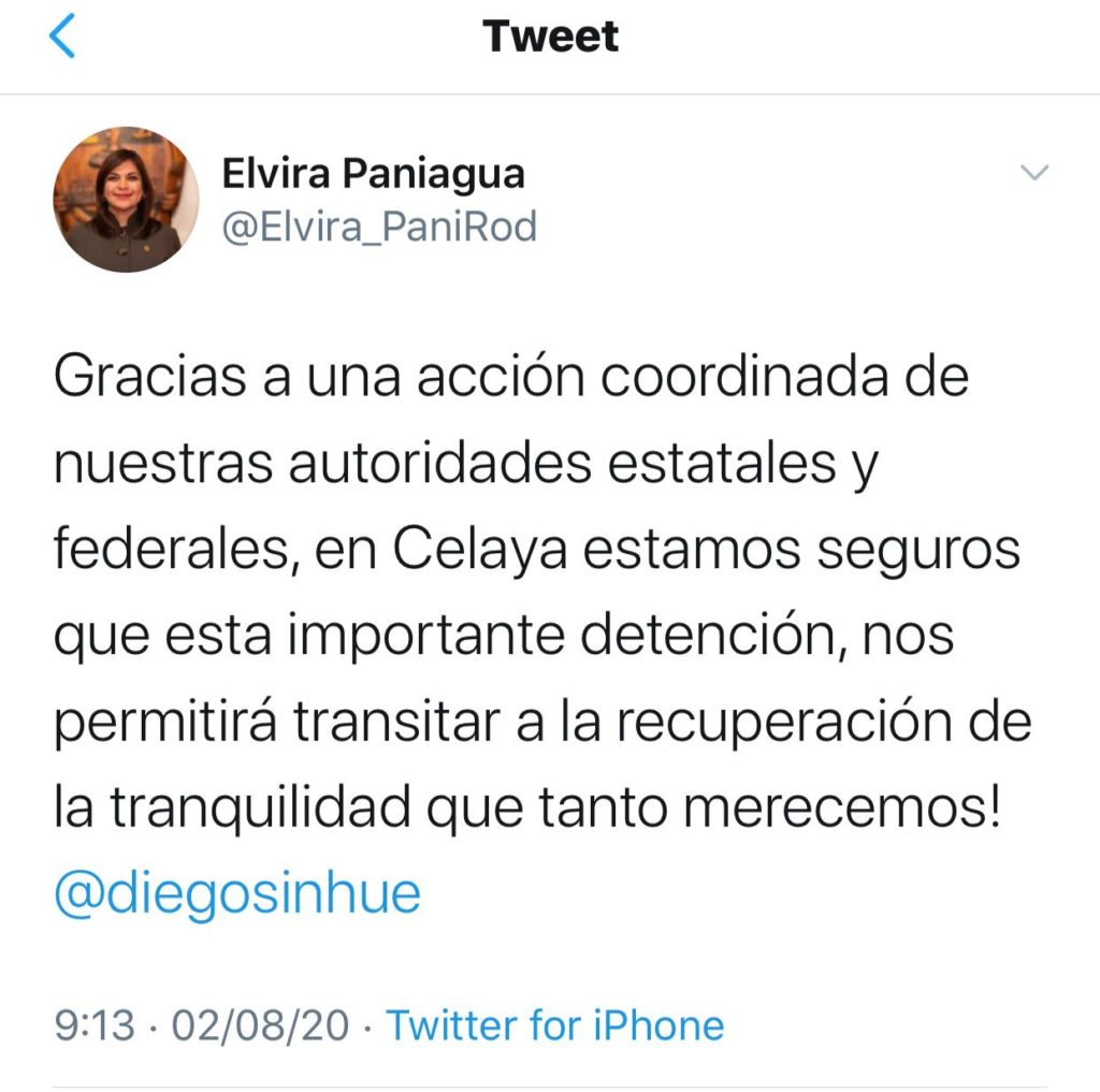 En su cuenta de Twitter la alcaldesa del municipio de Celaya Elvira Paniagua publicó el siguiente comunicado “Gracias a una acción coordinada de nuestras autoridades estatales y federales, en Celaya estamos seguros que esta importante detención, nos permitirá transitar a la recuperación de la tranquilidad que tanto merecemos!”.
