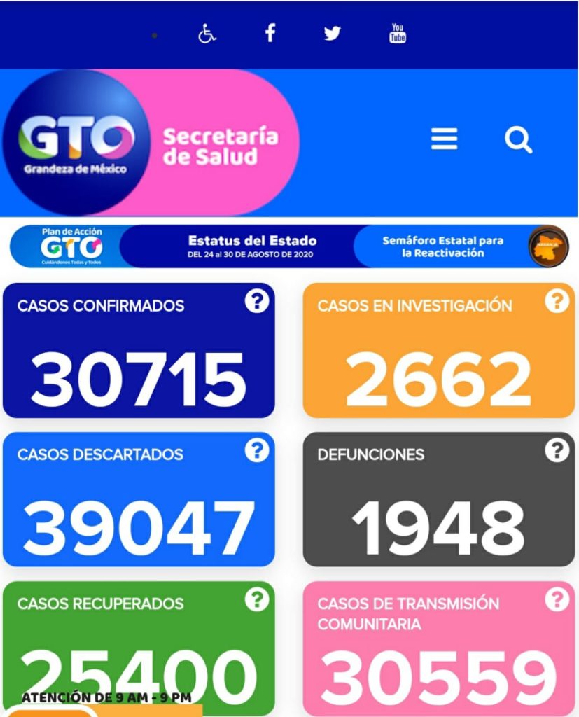 Toda nuestra información es con base a la tabla creada por la Secretaria de Salud la cual es actualizada cada que se registra algún caso de infección por el coronavirus, la cual pueden visitar en la página oficial https://coronavirus.guanajuato.gob.mx/.
