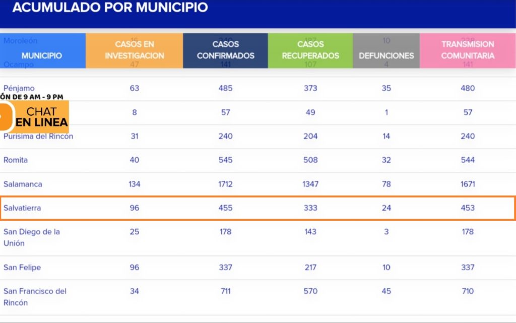 De acuerdo a la tabla donde se muestra lo acumulado por municipio, Salvatierra cuenta con 96 casos en investigación, 455 casos confirmados, 333 recuperados, 24 defunciones y 453 casos por trasmisión comunitaria, de los cuales 98 son los casos activos.