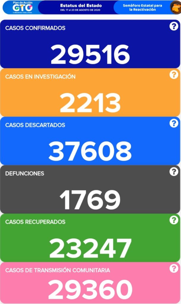 Toda nuestra información es con base a la tabla creada por la Secretaria de Salud la cual es actualizada cada que se registra algún caso de infección por el coronavirus, la cual pueden visitar en la página oficial https://coronavirus.guanajuato.gob.mx/.