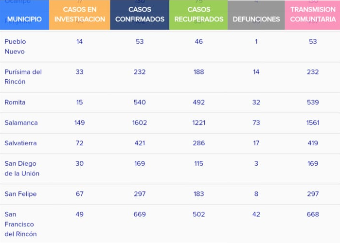 El municipio de Salamanca tiene hasta el momento 149 casos en investigación, 1,602 se han confirmado de los cuales 1,561 se han contagia por trasmisión comunitaria, 1,221 ya se han recuperado y cuenta con 73 defunciones; Celaya hasta el día de hoy sus casos en investigación son 153, teniendo aun 2,168 confirmados, de los cuales 2,158 se han contagiado por trasmisión comunitaria, 1,699 se han logrado recuperar y cuanta con 175 defunciones.