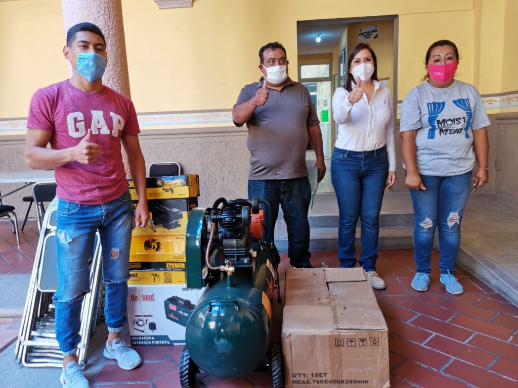 La mañana de este lunes 7 de septiembre la Presidente municipal Karla Alejandrina Lanuza Hernández y la titular de Fomento al Empleo Yatiziri Mendoza Jiménez entregaron equipo y herramientas de trabajo a las Carpintería Rodríguez y Medina, al taller de hojalatería y pintura García y a la Herrería San Juan, hasta por 25 mil pesos.