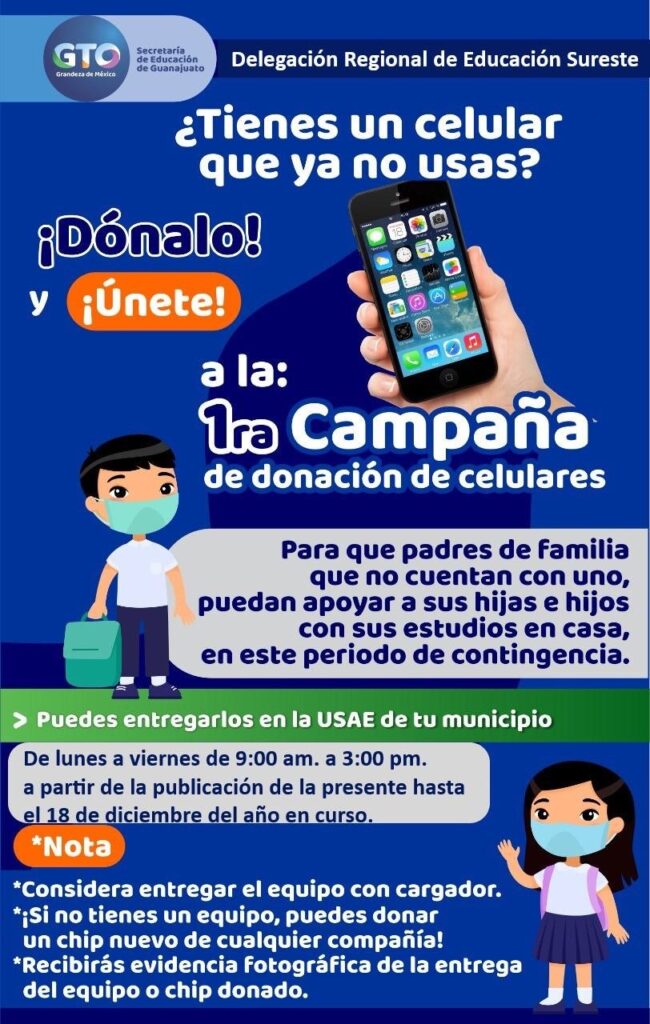 La Secretaría de Educación de Guanajuato (SEG), región Sureste invita a quienes deseen donar celulares nuevos, o usados en buenas condiciones, a acudir a la Unidad de Servicios de Apoyo a la Educación (USAE), de su municipio, de lunes a viernes en un horario de 9:00 a 15:00 hrs.