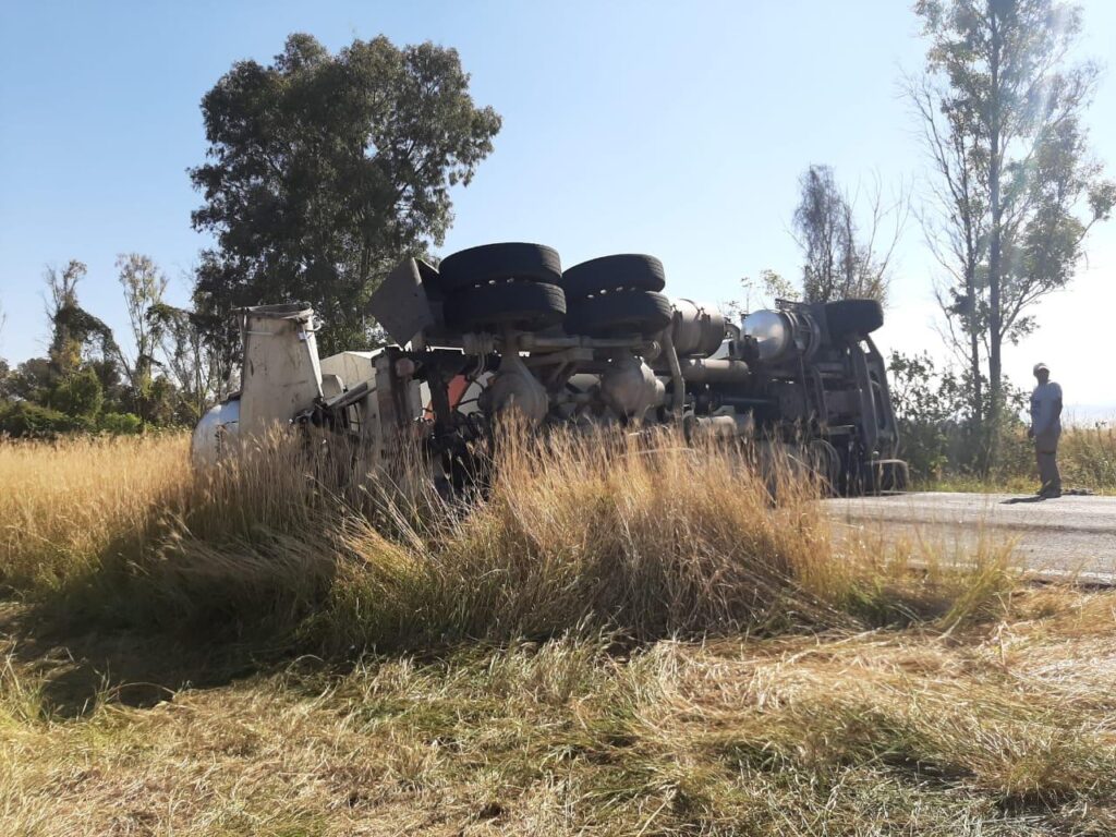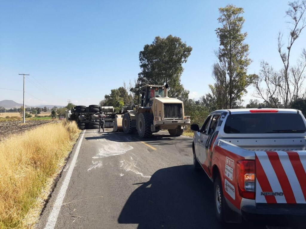 La mañana de este viernes se registró una volcadura, en la carretera Acámbaro – Jerécuaro a la altura de la entrada de la comunidad de San Cayetano; la pesada unidad termino a media carretera.