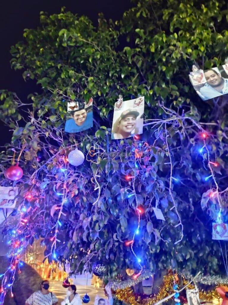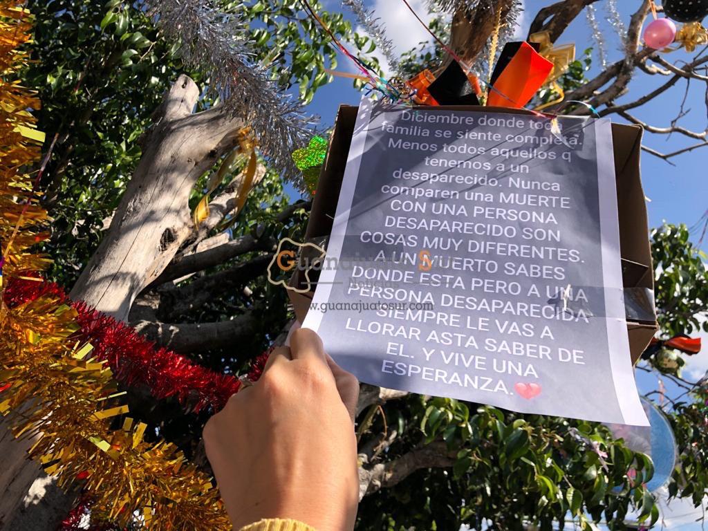 “Que los ojos de los desaparecidos los sigan a donde vayan y los llantos de sus madres nunca los dejen dormir” son algunas de las frases que colocaron en el árbol navideño de personas desaparecidas que adornaron en la explanada del Carmen en Salvatierra.