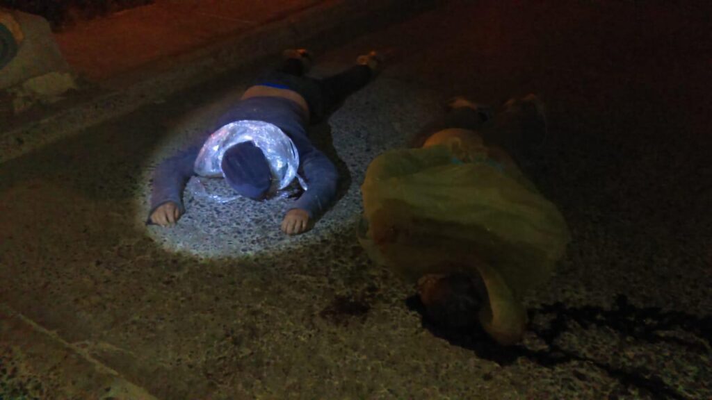 En el sitio encontraron a dos hombres boca abajo de identidad desconocida que las presentaban huellas de violencia y heridas producidas por arma de fuego tras lo cual se colocó la cinta amarilla dando aviso a la autoridad competente.