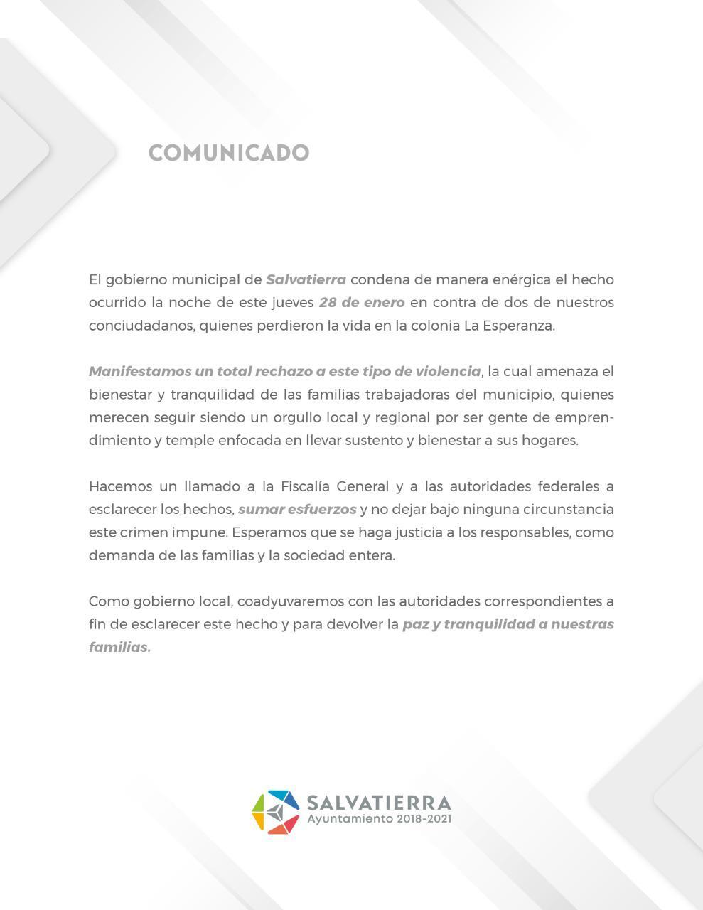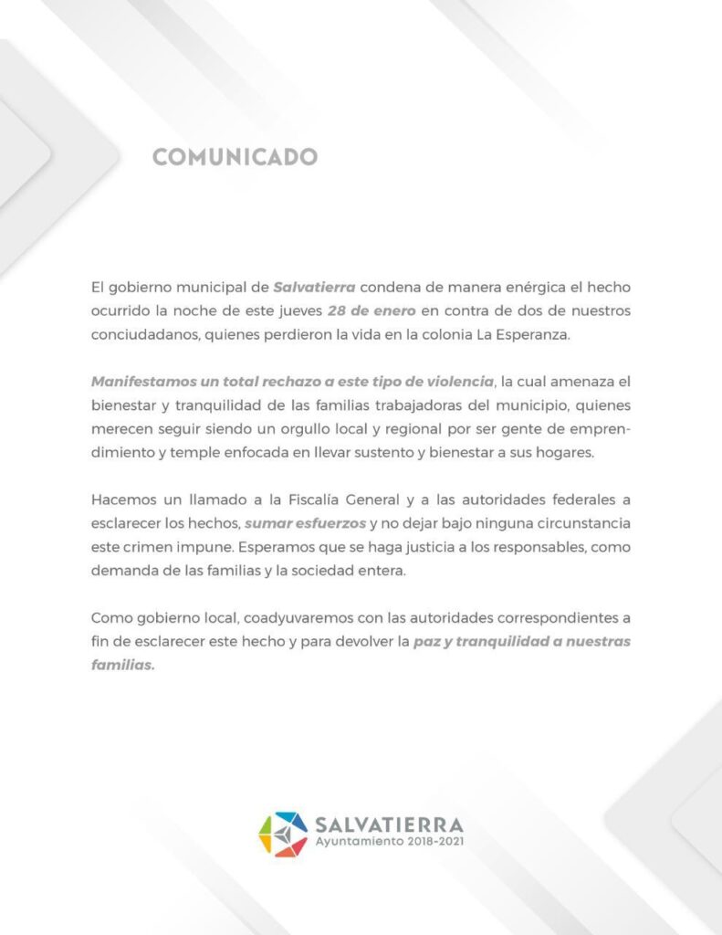 El gobierno municipal de Salvatierra condena de manera enérgica el hecho ocurrido la noche de este jueves 28 de enero en contra de dos de nuestros conciudadanos, quienes perdieron la vida en la colonia La Esperanza.