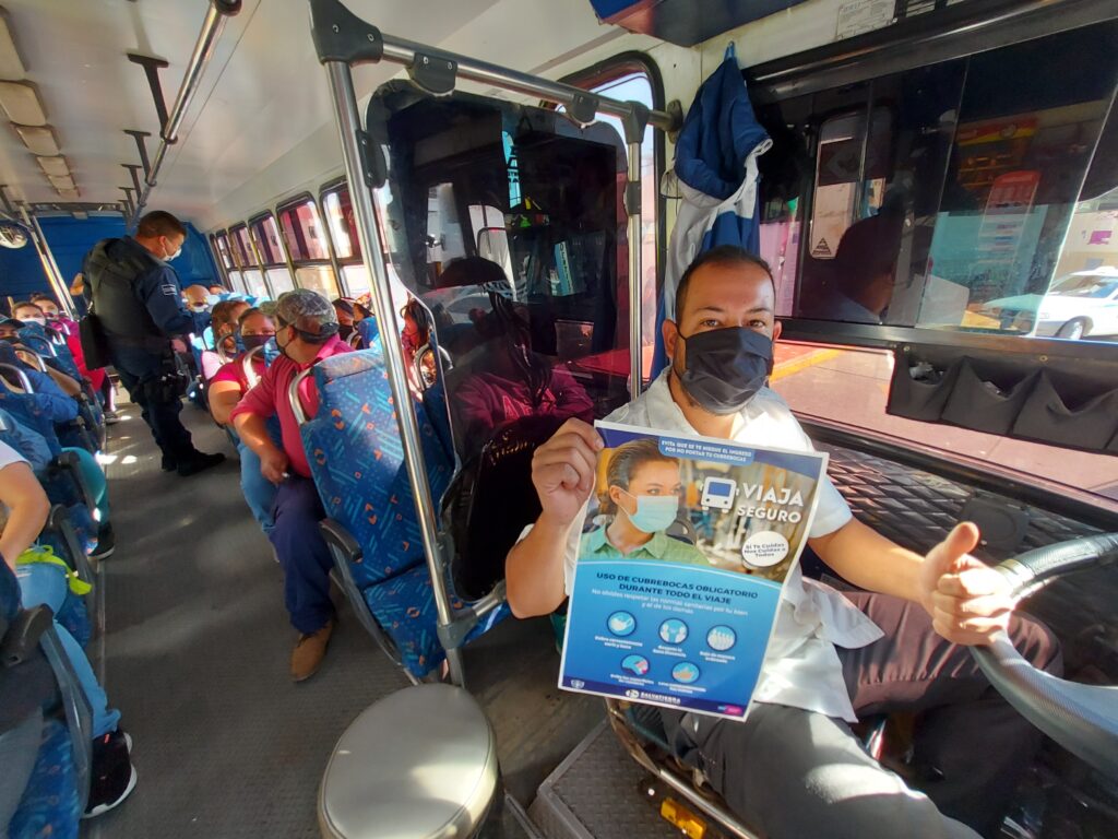Personal del área de Tránsito y Transporte Municipal puso en marcha el proyecto “Viaja Seguro” supervisando que los choferes y personas que usan el transporte público acaten las medidas de sanidad correspondientes principalmente el uso adecuado del cubrebocas, desinfección constante de manos y en lo posible mantener la sana distancia.