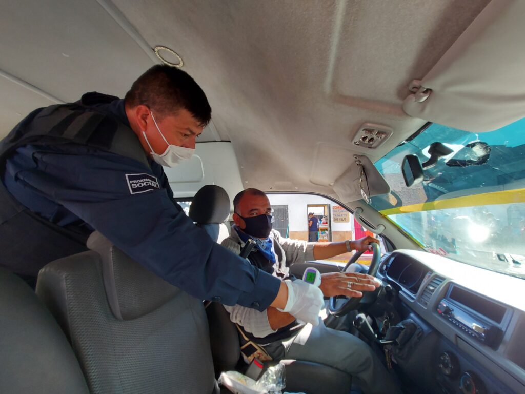 Dentro de las acciones realizadas el día de hoy se encuentran: recordaron las medidas de sanidad correspondientes, realizaron la toma de temperatura a choferes y pasajeros, además de regalar gel antibacterial.