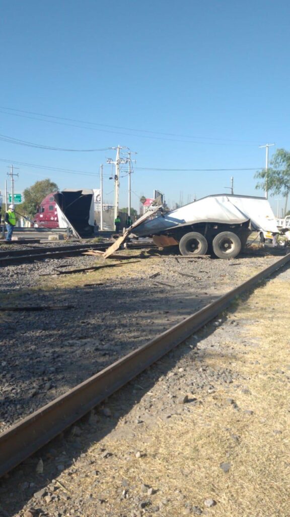 La caja de un tráiler resultó pérdida total tras ser arrastrado por el tren en Av. 12 de Octubre esquina Consepción Beristain en esta ciudad.
