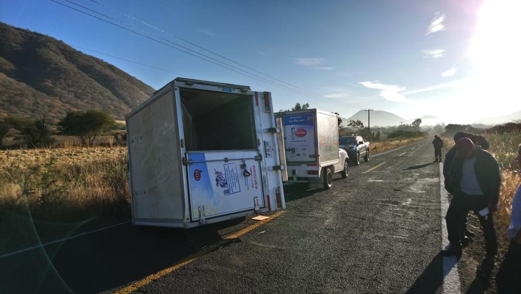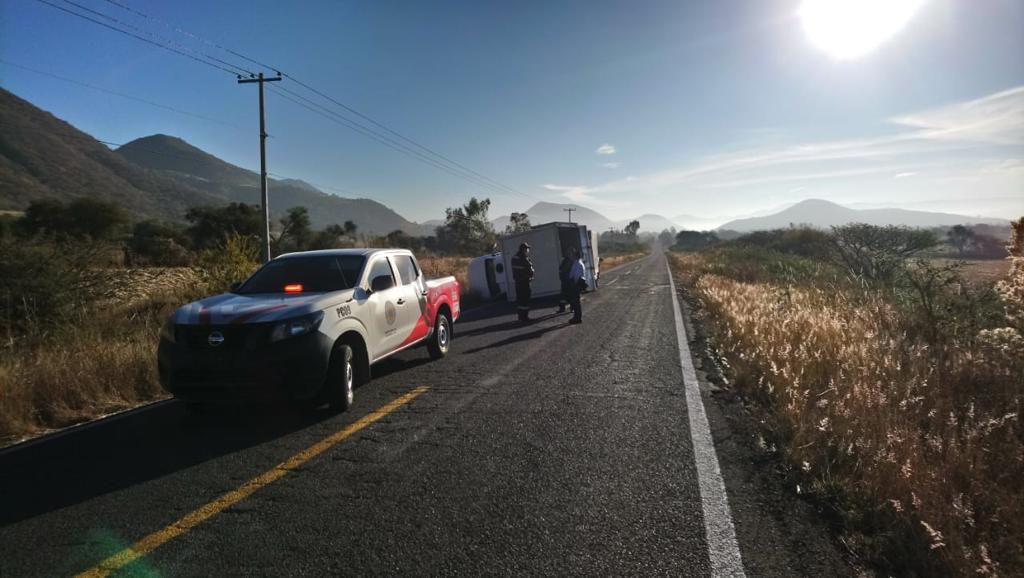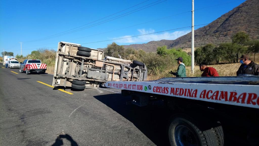Hoy alrededor de las 9:00 de la mañana se registró un accidente de tránsito en la carretera Irámuco – Puerto de Cabrás donde el conductor de una camioneta de la empresa gota blanca, perdió el control de su unidad quedando volcada a media carrera, obstruyendo el paso vehicular de un carril.