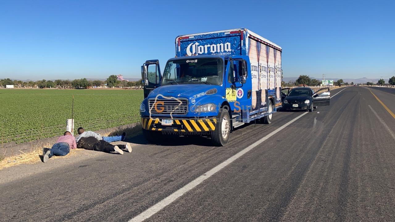 Cerca de las 11:00 horas de este martes tres sujetos fueron sorprendidos cuando intentaban robar una unidad de una compañía cervecera sobre la carretera Villagrán- Juventino Rosas.