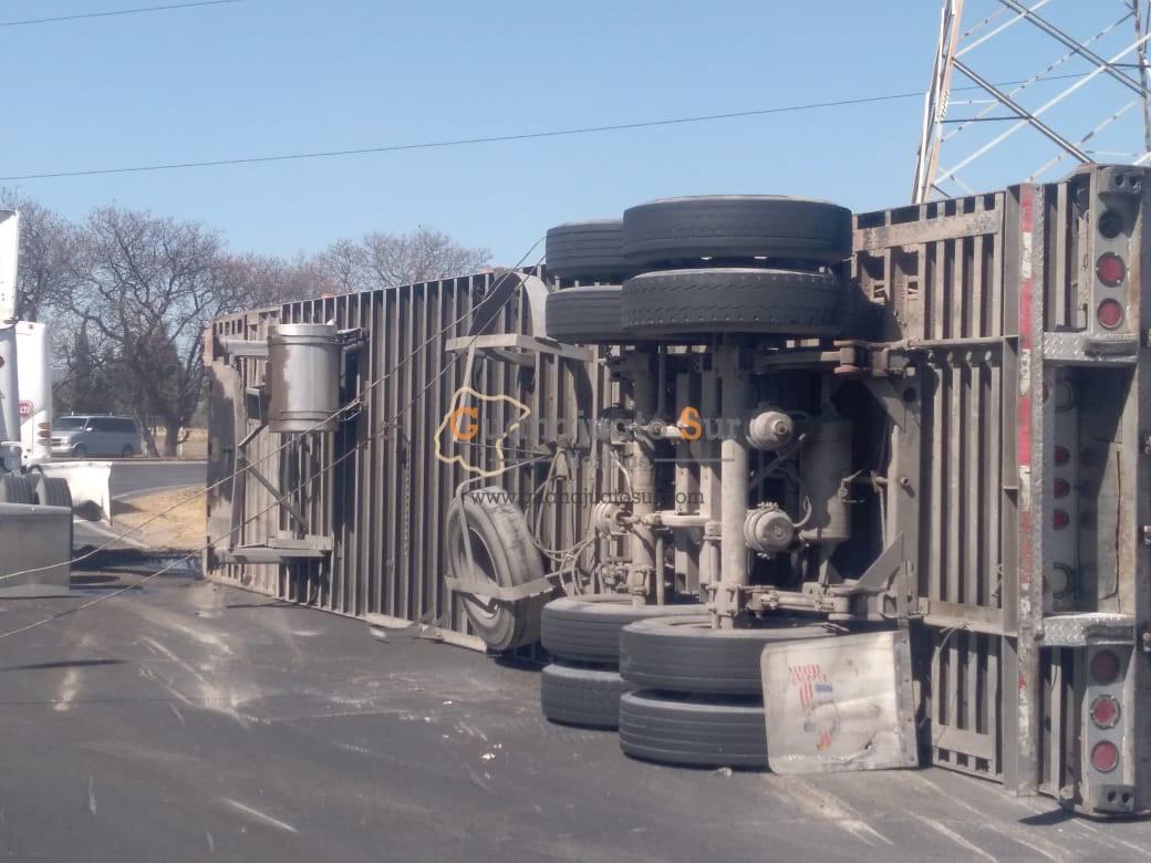 En la zona localizaron a un tractocamión en color blanco recostado de su lado izquierdo el cual se dijo que presuntamente circulaba a exceso de velocidad lo que provocó que el conductor perdiera el control y quedar volcado sin que resultarán personas lesionadas.