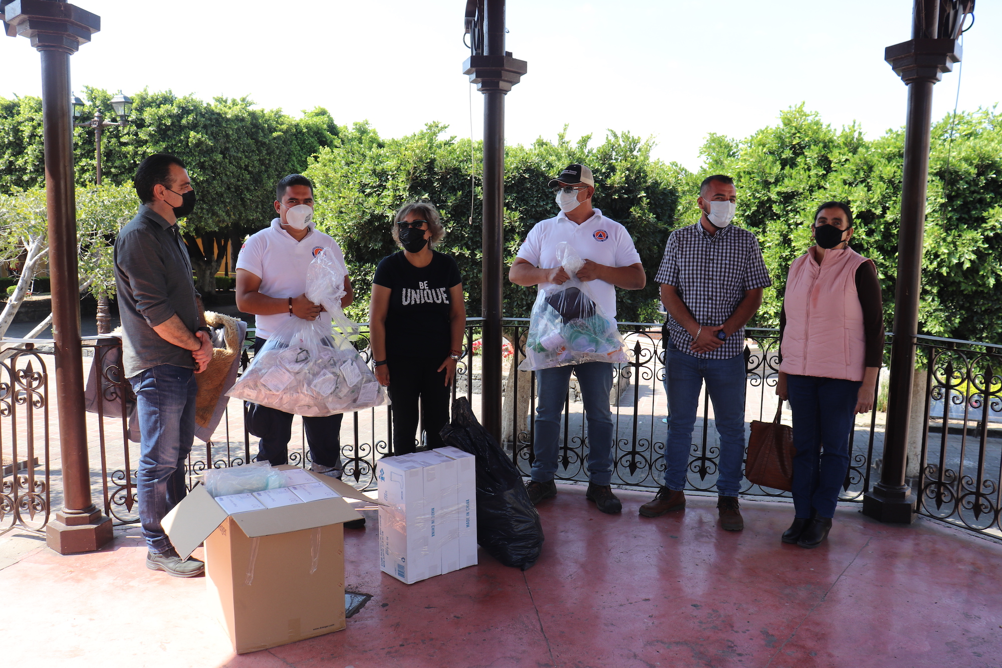 El Presidente Municipal Constitucional, Salomón Carmona Ayala y los Regidores, Yassay Daniel Duran Cazares, José Guerrero Santoyo, Lázaro Díaz Gonzales y Olivia García Rosales; se dieron cita en el quiosco del jardín principal para hacer entrega de 100 paquetes de material quirúrgico al titular de la dirección de Protección Civil.