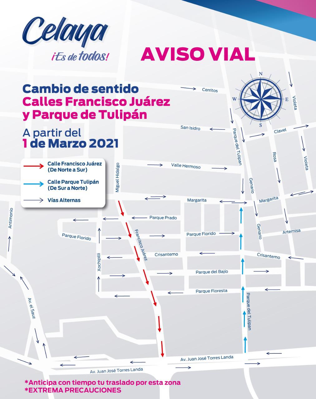 En el caso de Francisco Juárez, se dará continuidad al proyecto que se puso en marcha meses atrás, ahora, eliminando el doble sentido desde avenida Torres Landa hasta Parque de la Margarita, en donde a partir de la fecha mencionada el sentido será solamente hacia el sur.