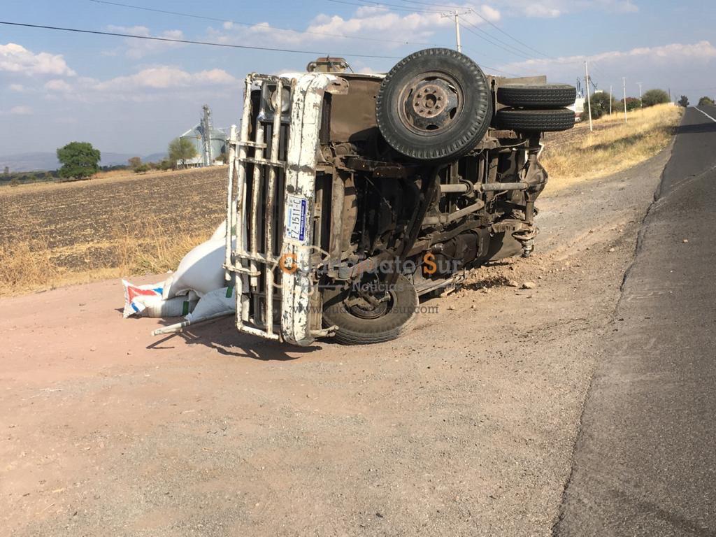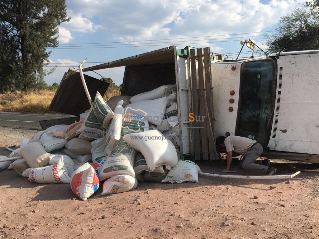 Se registró una volcadura de una camioneta de redilas que transportaba costales de alimento, en la carretera Salvatierra Yuriria a la altura de la comunidad de Santo Tomás Huatzindeo, donde por fortuna no resultaron personas lesionadas.