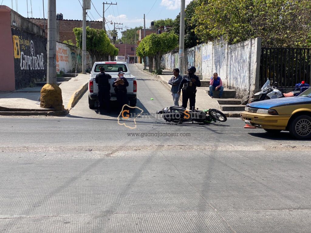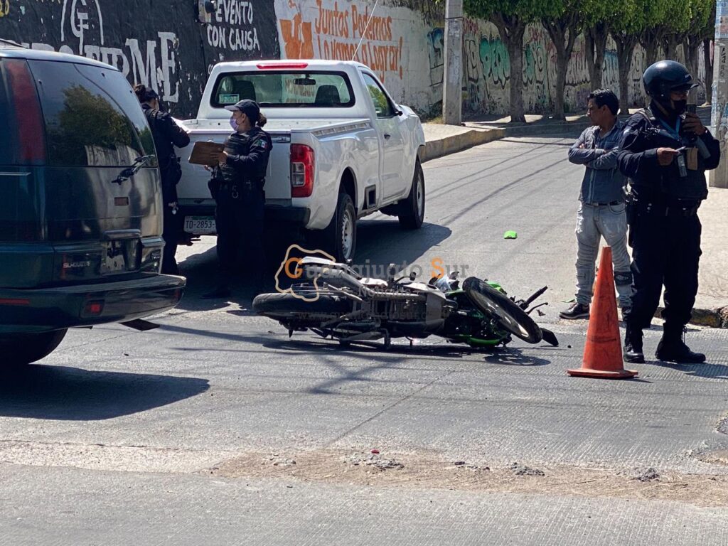 Poco después de las 11:30 horas se registró un accidente vehicular del tipo choque entre una camioneta blanca y una motocicleta Italika 150z teniendo como resultado a una persona lesionada.