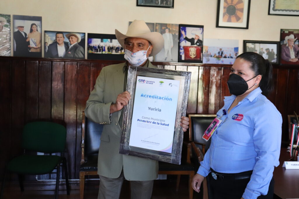El Presidente Municipal Constitucional, Salomón Carmona Ayala, recibió el distintivo “Municipio Promotor de la Salud”, por Psic. Karla Quintana, Promotora Municipal de la Salud, en representación de la M.S.P. Ana María Vargas Martínez, Directora de CAISES Yuriria.