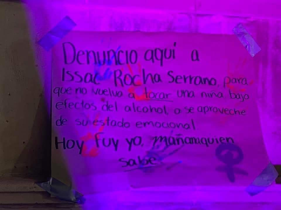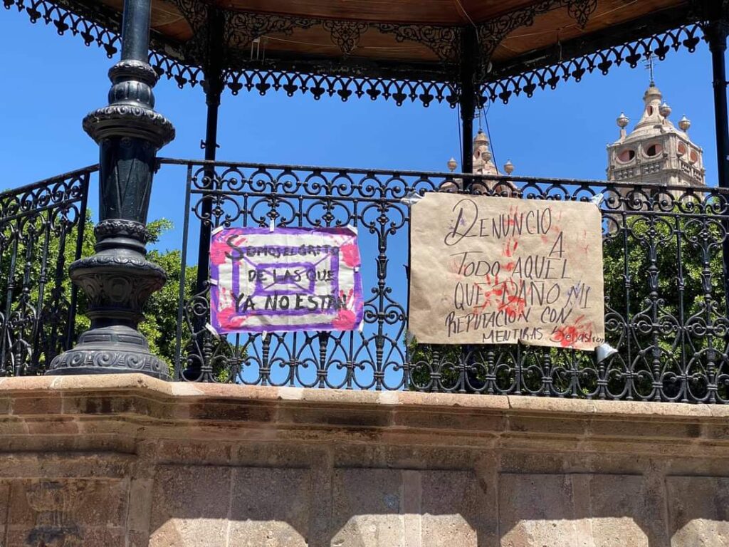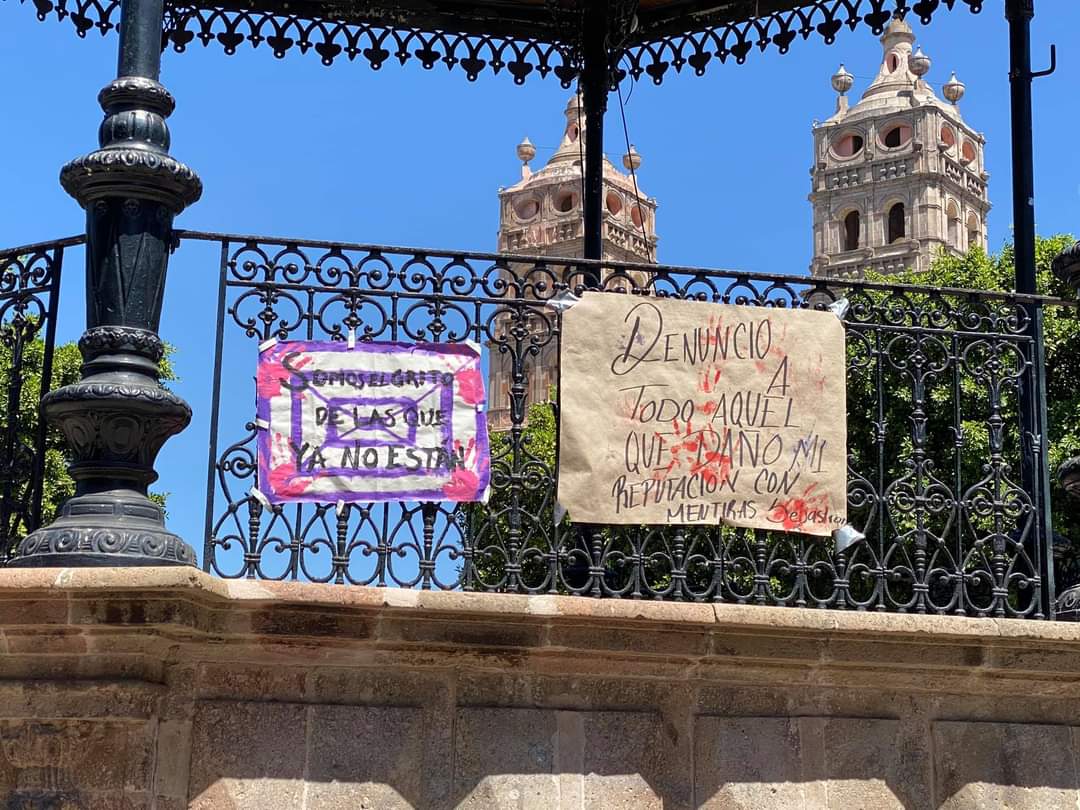 En el Kiosco de Salvatierra en apoyo al día internacional de la mujer, se colocaron pancartas con las leyendas: “Somos El grito de las que ya no estan”, “Denunció a todo aquel que dañó mi reputación con mentiras Sebastián R.”.