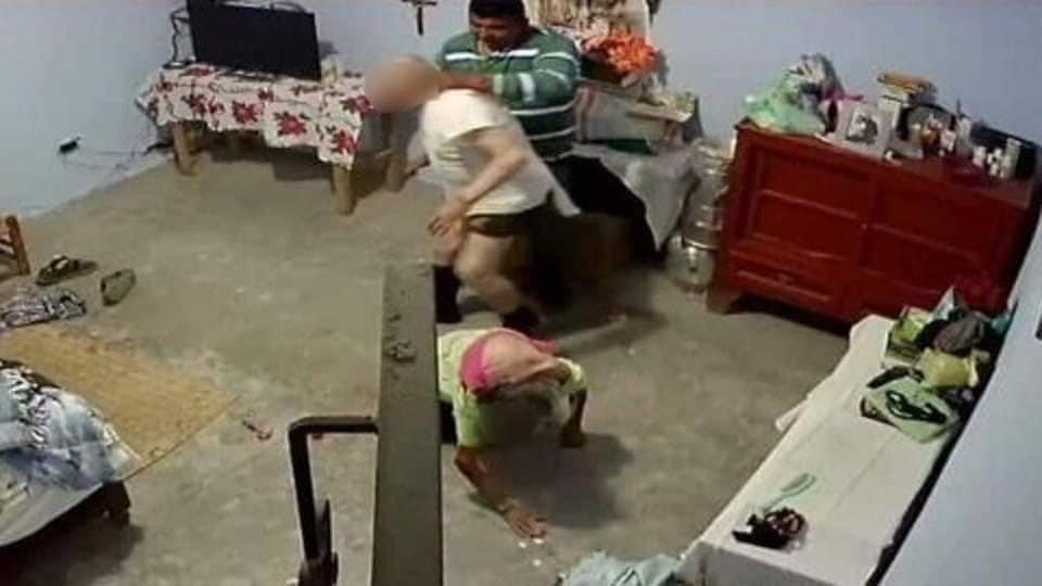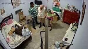 Se observa también a la señora, de edad avanzada, con ropa interior, en el suelo y el agresor empuja al señor, en paños menores, hacia adelantepara que después el asaltante se llevara algunos objetos del lugar y huyera sin darse cuenta que era grabado por la cámara de seguridad.