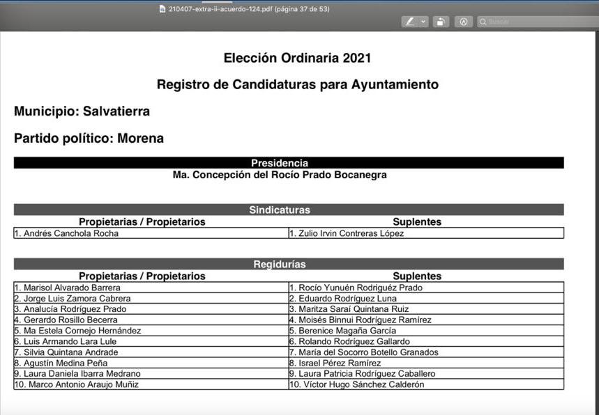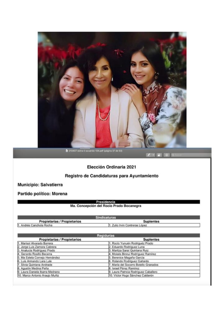 En dicha publicación destaca que Rocio Yunuen Rodríguez Prado hija de la candidata va como suplente en la primera regiduría, mientras que su otra hija Analucia Rodríguez Prado va como titular en la tercera regiduría; En la primera regidora como titular Marisol Alvarado Barrera se desempeñaba hasta hace poco como titular de Bienestar en Salvatierra; así mismo el actual regidor de MORENA Jorge Luis Cabrera Zamora busca la eleccion consecutiva en el mismo cargo registrándose nuevamente en la segunda regiduría como en la elección pasada.