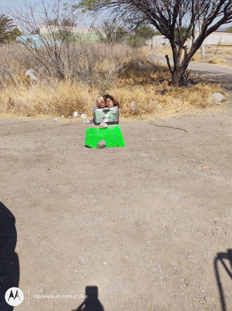En este sitio las cabezas fueron dejadas arriba de una hielera junto con un mensaje escrito alusivo a un grupo delicuencial.